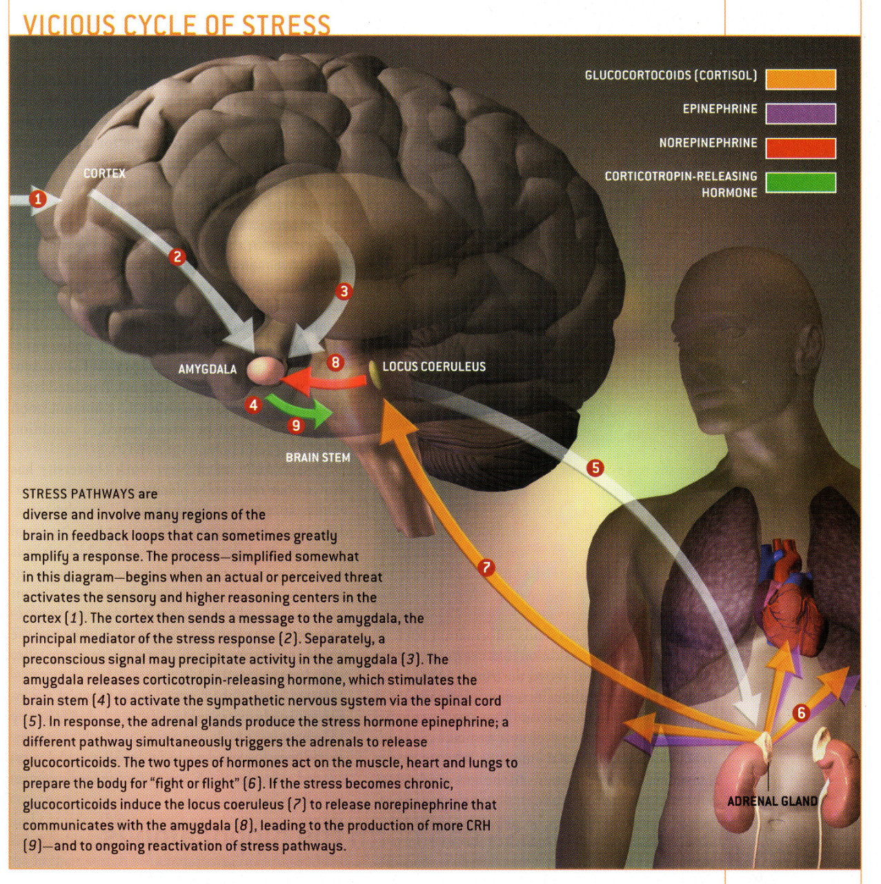 Når man i en periode får stress, reagerer kroppen ved, at man får klamme hænder, forøget puls og forøget energi. Kamphormonet adrenalin udløses og kroppen forøger sin produktion af stresshormonet Cortisol.
